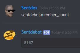 Now, if we do sentdebot.member_count in the discord, the bot replies with our number 8167 in my case.
