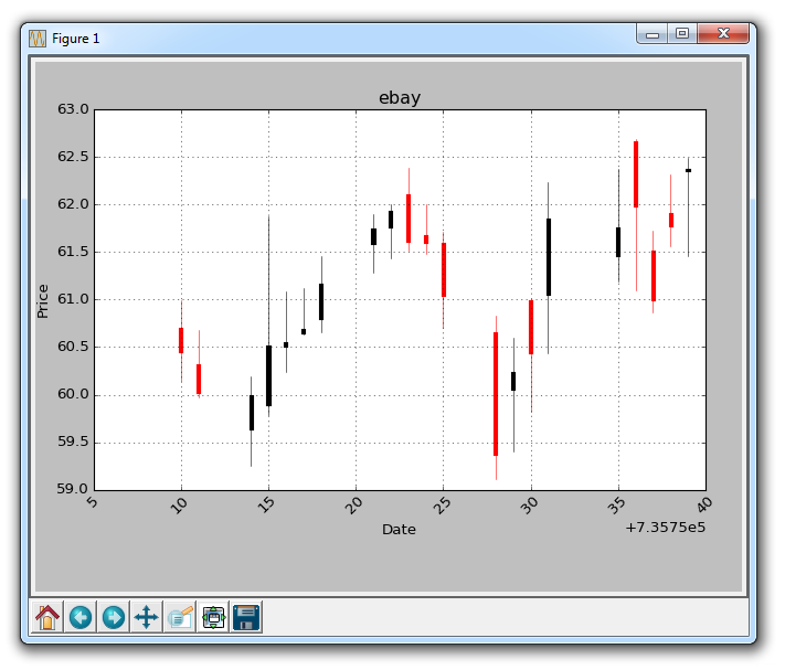 With this, we now have a list of OHLC data stored to our variable called ohlc. Now we can plot this with: