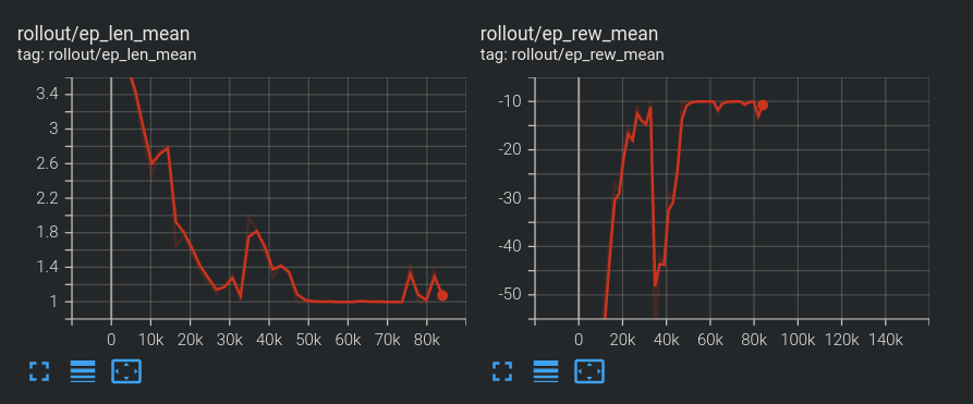 Quite simply, this agent learned that living is very painful and the quickest way to the highest reward is to go ahead and stop living. You can see that reward was typically a very large negative and then it rises as episode length decreases up to the point of -10 and it just holds there, so the agent was just simply spawning and running into itself immediately to end the game. This is a good example of how things can go awry with what we think might be a good reward, but it turns out to be no good.