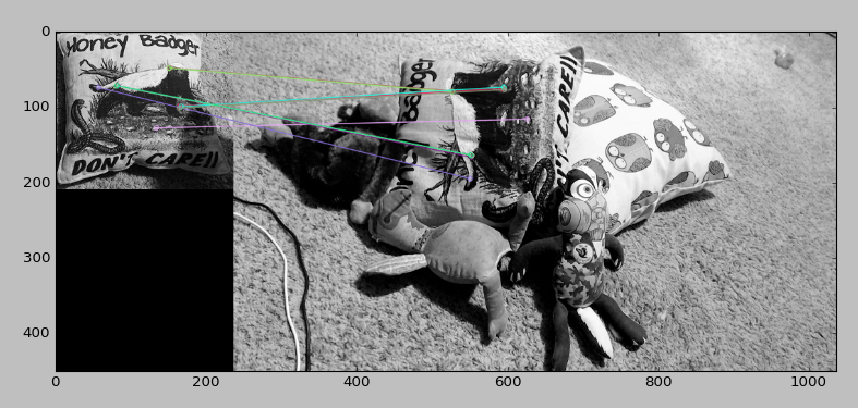 img3 = cv2.drawMatches(img1,kp1,img2,kp2,matches[:10],None, flags=2) plt.imshow(img3) plt.show()