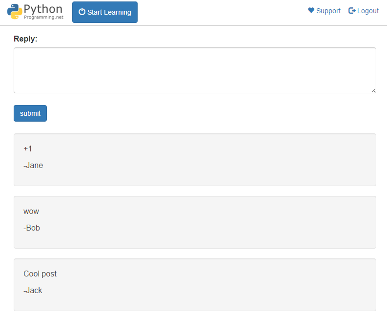 Now, below our reply box, whether or not the user is logged in, we iterate through the replies and display them on screen. This is not the most beautiful looking, so feel free to improve on it if you like. The current look should be something like: