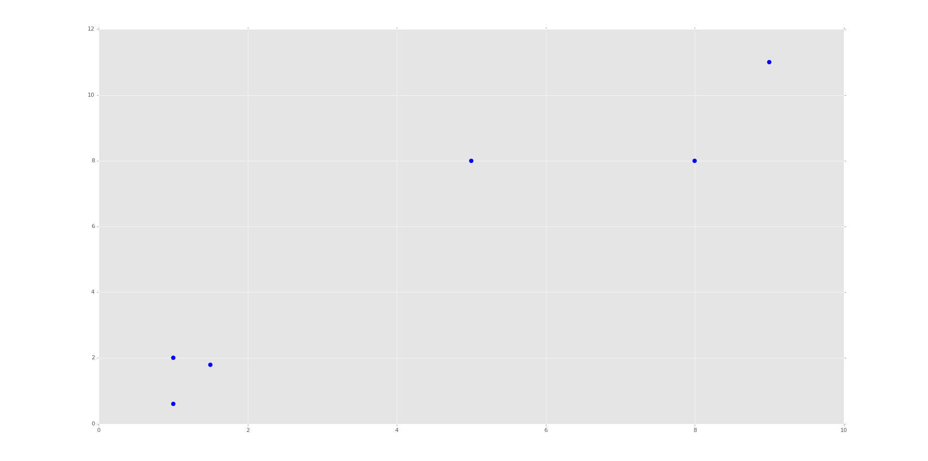 x = [1, 5, 1.5, 8, 1, 9] y = [2, 8, 1.8, 8, 0.6, 11] plt.scatter(x,y) plt.show()