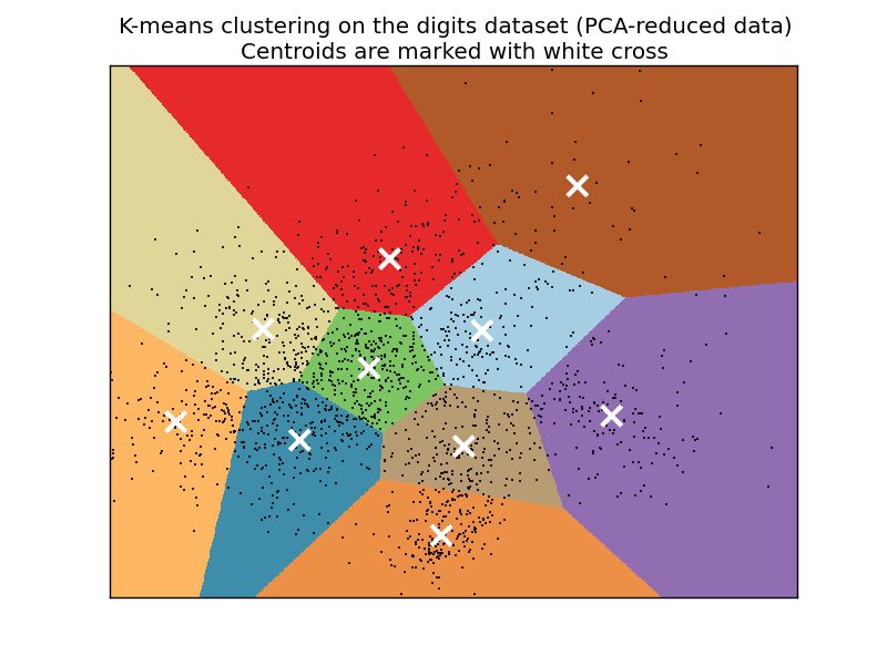 Do you see the Voronoi cells? I hope not, we didn't draw them. Remember, those are the polygons that mark the divisions between clusters. Here, we have each plot marked, by color, what group it belongs to. We have also marked the centroids as big blue "x" shapes.
