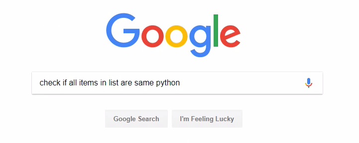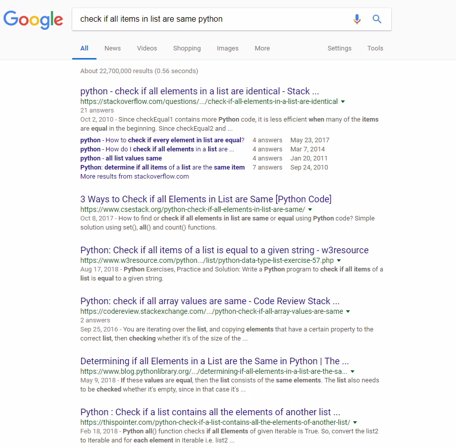 Let's check out that top stack overflow (SO) example. Just in case your search didn't yield the same results, here's the link to this one specifically: check if all elements in a list are identical.