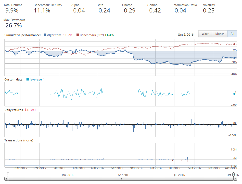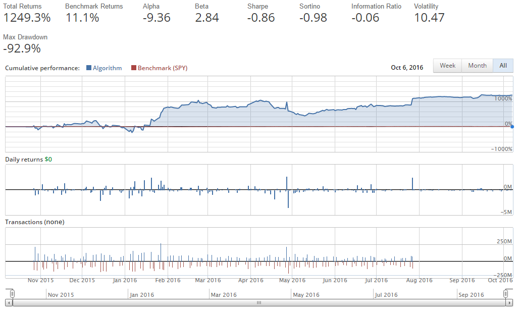 When you first write an algorithm, especially when starting out, something like this is fairly likely to occur. Maybe it's in your favor, or maybe you lost 1000% of your starting money, and you're wondering what happened. In this case, it is super easy to spot. First off, our returns are incredibly unlikely, and, given just the basic readout from Quantopian, we can see that immediately we're doing transactions to the tune of multiple 10's of millions of dollars, and even hundreds of millions of dollars, when our starting capital was meant to be $1 million.